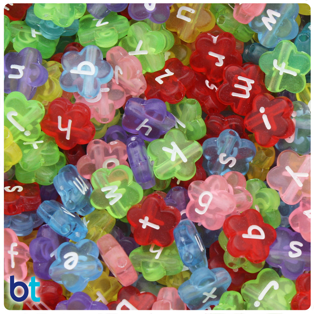 These mixed transparent flower shaped alphabet plastic beads measure 12mm diameter by 10mm thick and have a 1mm hole which runs horizontally to the letter which is imprinted on both sides of the beads in white. These craft beads are imported from China and sold in packs of approx. 120 beads. Our alpha beads are perfect for personalizing necklaces, bracelets, key chains and all manner of kandi designs.