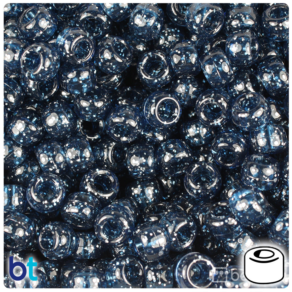 Our montana blue, in a glittery silver sparkle finish barrel shaped plastic pony beads, measure 6mm high by 9mm wide and have a 4mm hole which runs vertically down the middle of the bead. These plastic pony beads are made in the USA with high-quality, non-toxic polystyrene plastic and sold in packs of approx. 500 beads. Pony beads are ideal for a wide variety of projects like; necklaces, bracelets, kandi and dream catchers. The larger hole is easier to thread so makes them perfect for children's parties, activity camps and VBS.