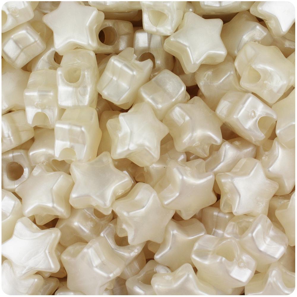 These natural ivory pearl star shaped pony beads measure 13mm wide by 13mm high and have a 4mm hole which runs vertically down the middle of the beads. Our plastic pony beads are made in the USA with high-quality plastic and come in packs of approx. 50 beads.