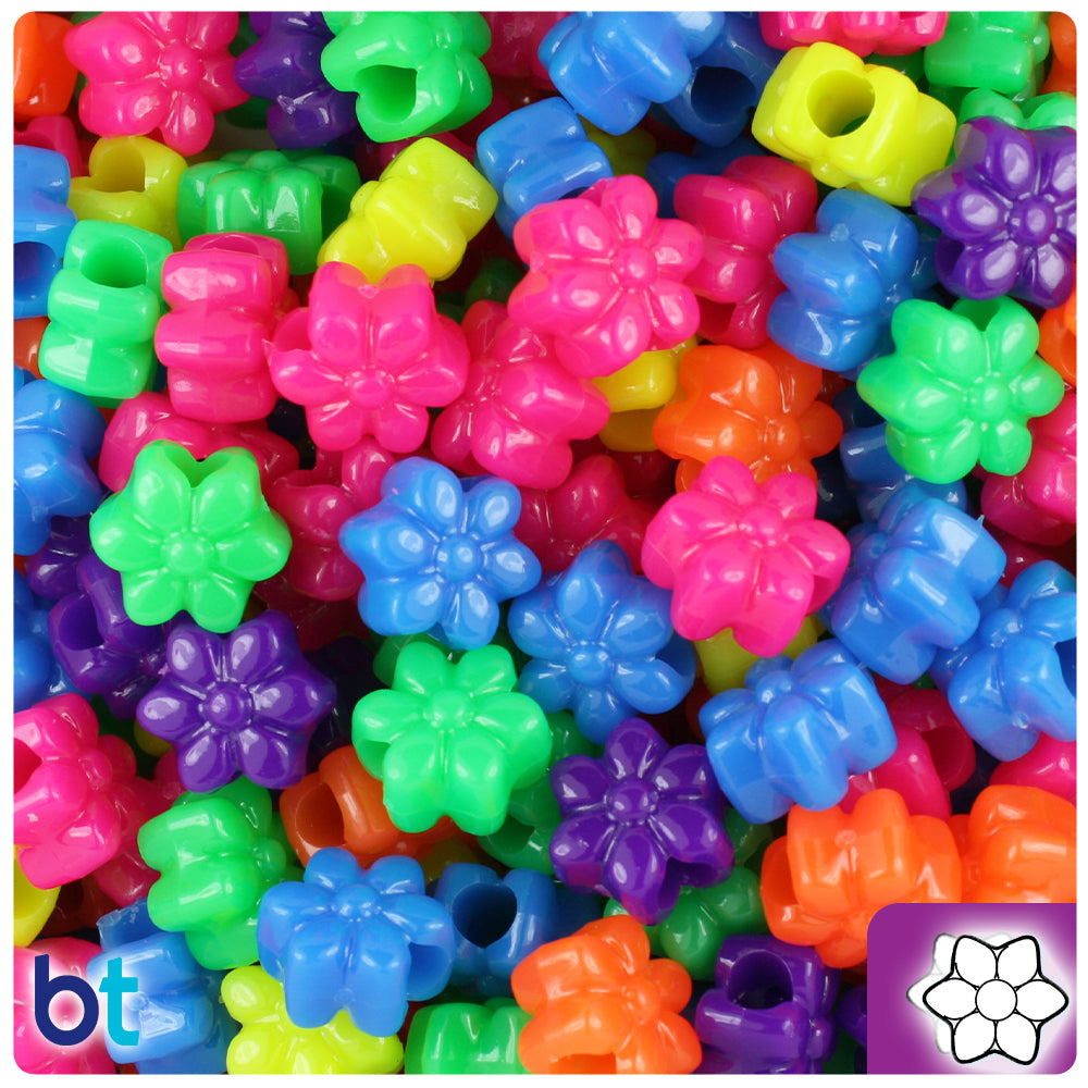 Our multi-colored mix, in a bold and bright neon like finish, flower shaped plastic pony beads, measure 13mm wide by 13mm high and have a 4mm hole which runs vertically down the middle of the bead. These plastic pony beads are made in the USA with high-quality, non-toxic polystyrene plastic and sold in packs of approx. 250 beads. Pony beads are ideal for a wide variety of projects like; necklaces, bracelets, kandi and dream catchers. The larger hole is easier to thread so makes them perfect for children's parties, activity camps and VBS.