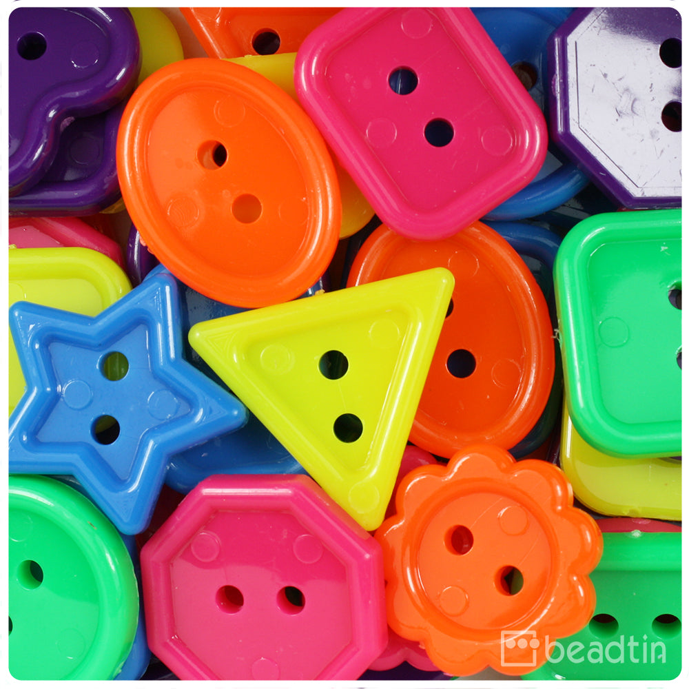 Novelty button mix of hearts, flowers, stars, triangles, oval, square, rectangle, round and octagonal in a bold neon light finish with random colors. Made in the USA and sold in packs of 4oz which is approx. 60 buttons
