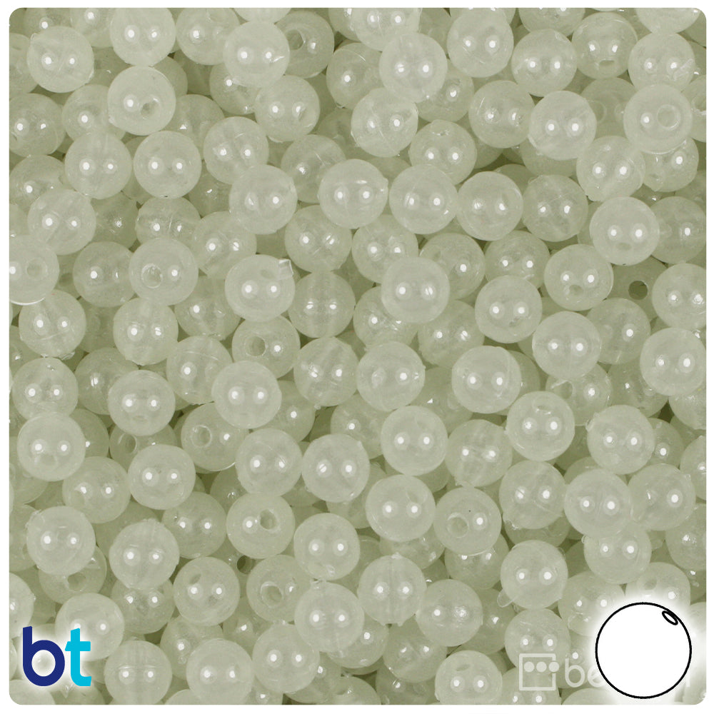 Our night clear, in a glow in the dark finish, round plastic craft beads measure 6mm diameter and have a 1mm hole which runs through the center of the bead. These plastic craft beads are made in the USA with high-quality plastic and come in packs of approx. 500 beads. Craft Beads are ideal for making necklaces, bracelets, key chain and other jewelry projects, as well as holiday decorations, home bedazzling and many other craft ideas. They are also perfect for children's craft projects and church or activity camps. Craft Beads come with a small 1-2mm hole, so they will fit on a range of threading material like elastic cord, stretchy cord and jewelry wire.