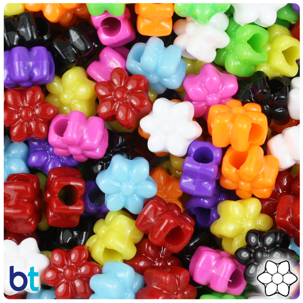 Our multi-colored mix, in a shiny opaque finish, flower shaped plastic pony beads, measure 13mm wide by 13mm high and have a 4mm hole which runs vertically down the middle of the bead. These plastic pony beads are made in the USA with high-quality, non-toxic polystyrene plastic and sold in packs of approx. 250 beads. Pony beads are ideal for a wide variety of projects like; necklaces, bracelets, kandi and dream catchers. The larger hole is easier to thread so makes them perfect for children's parties, activity camps and VBS.