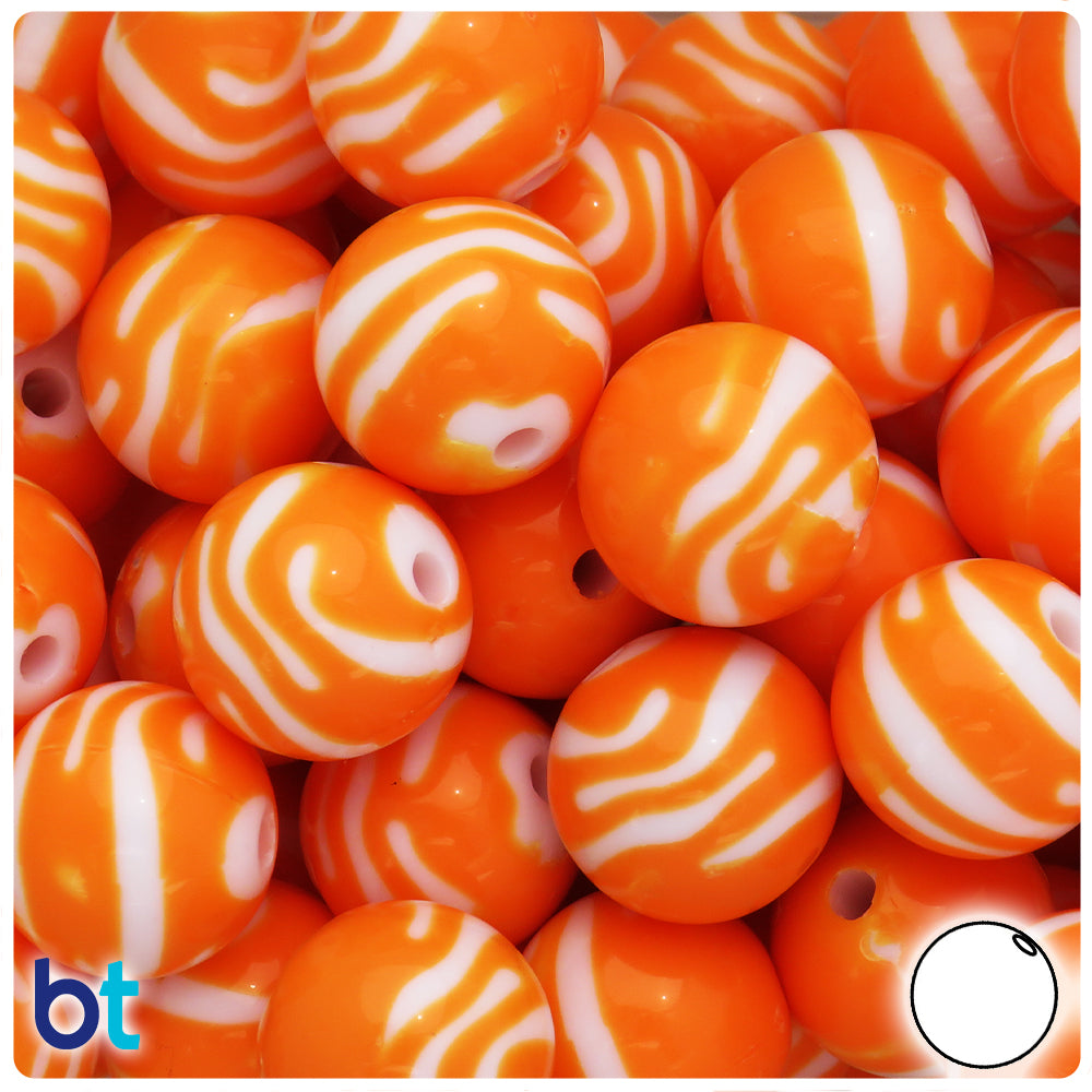 Our orange with white zebra stripes, shiny opaque finish round plastic craft beads measure 19mm by 18.3mm (hole to hole) and have a 2.5mm hole which runs through the center of the bead. These plastic craft beads are imported from China and come in packs of approx. 12 beads. Craft Beads are ideal for making necklaces, bracelets, key chain and other jewelry projects, as well as holiday decorations, home bedazzling and many other craft ideas. These chunky style beads are also known as bubblegum beads due to their size