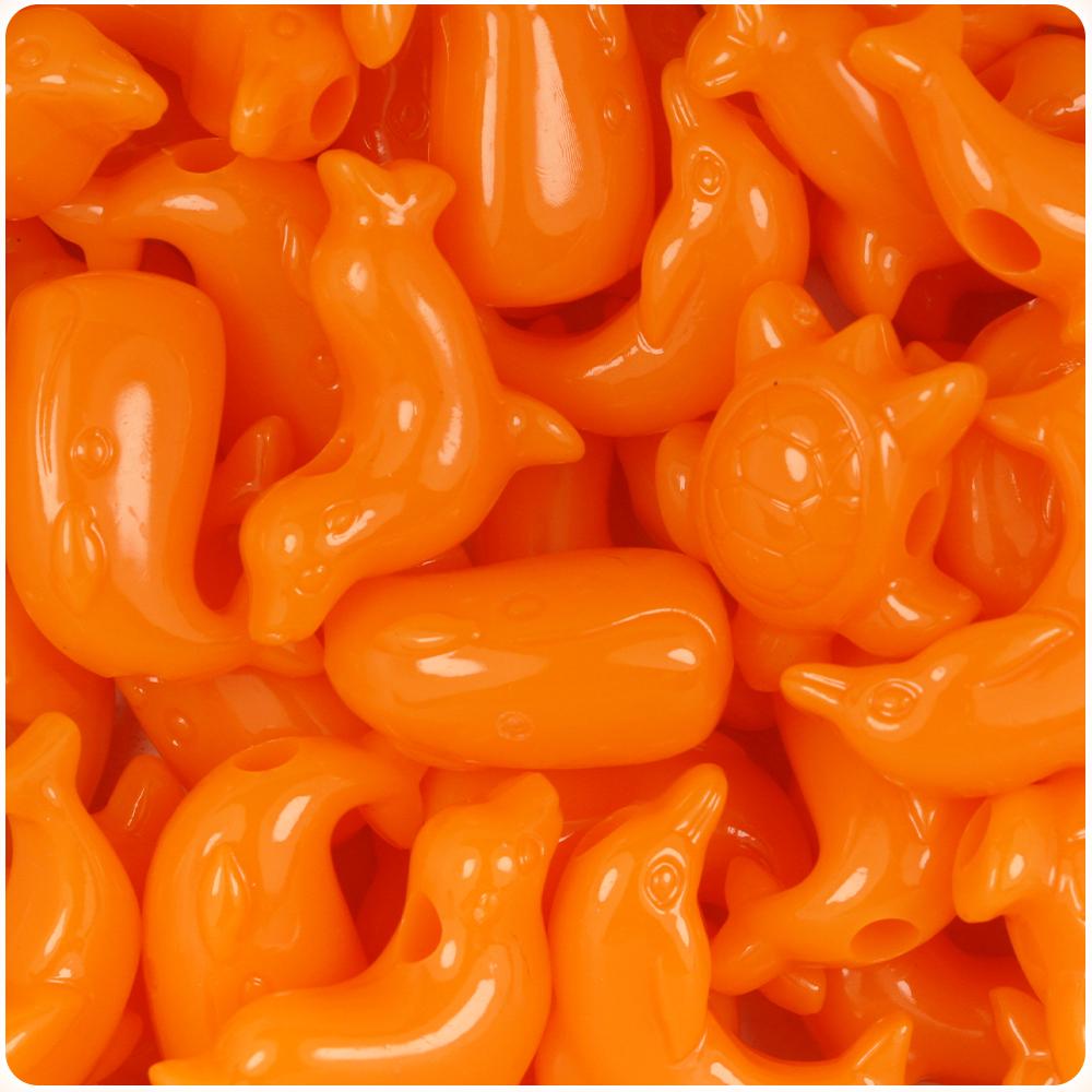 A pack of orange opaque marine life shaped novelty pony beads, in a mix of dolphins, seals, whales and sea turtles. These plastic pony beads measure between 23mm and 25mm, all with a 4mm hole running through the bead. Our pony beads are made in the USA with non-toxic polystyrene plastic and are sold in packs of 8 beads.