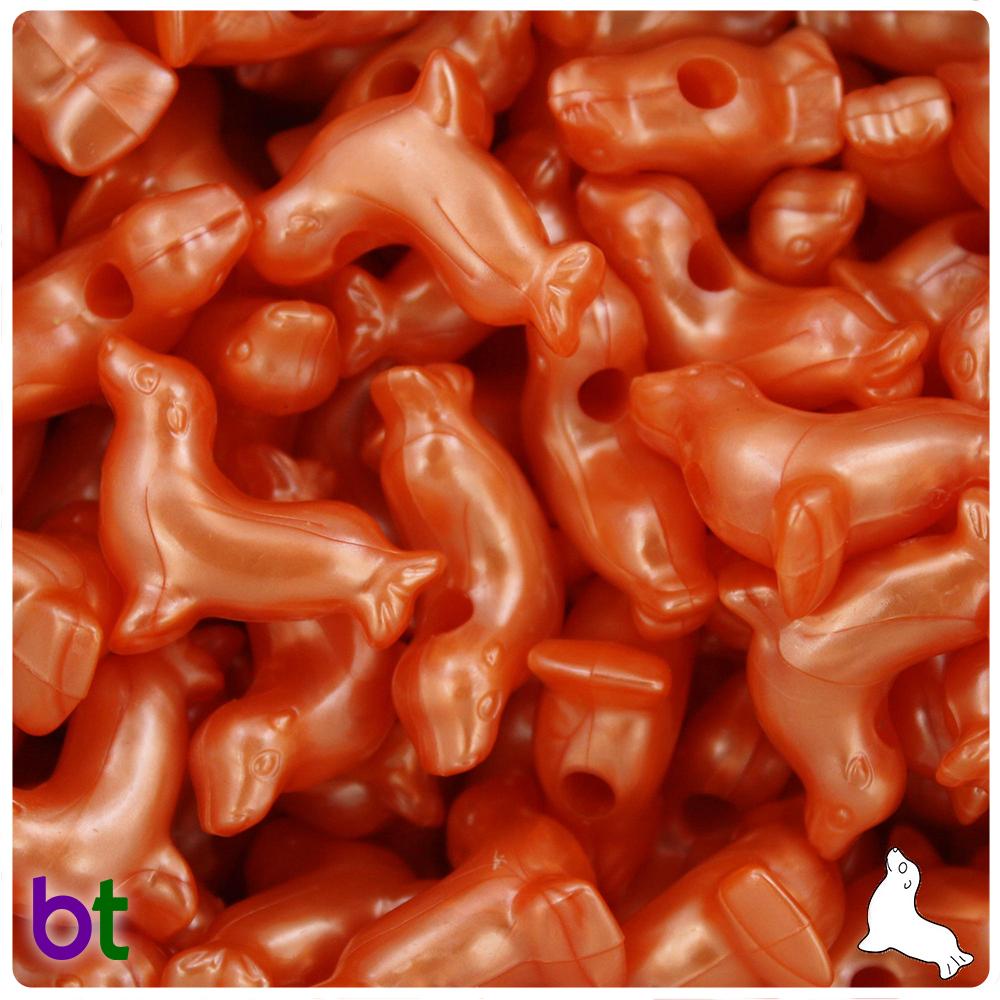 A pack of orange pearl finish seal shaped novelty pony beads from the marine life series. These plastic pony beads measure 24mm long and 21mm high, with a 4mm hole running across the middle of the bead. Our pony beads are made in the USA with non-toxic polystyrene plastic and are sold in packs of 8 beads.