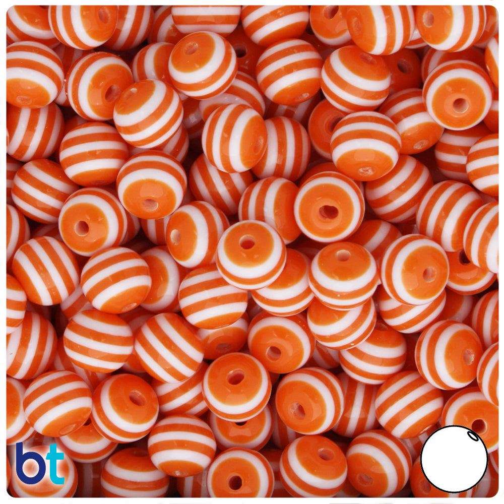 These orange and white striped round resin beads measure 10mm diameter with a 1.5mm hole which runs through the center of the bead. Our resin craft beads are imported from China and these come in packs of approx. 75 beads.