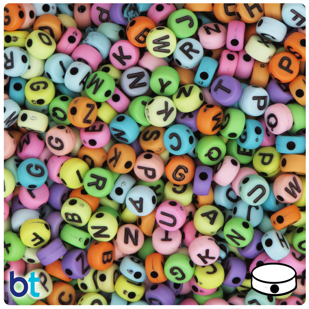 These mixed opaque pastel colored coin shaped alphabet plastic beads measure 7mm diameter by 4mm thick and have a 1mm hole which runs horizontally to the letter which is imprinted on both sides of the beads in black. This pack contains a random mix of letters. These craft beads are imported from China and sold in packs of approx. 250 beads. Our alpha beads are perfect for personalizing necklaces, bracelets, key chains and all manner of kandi designs.