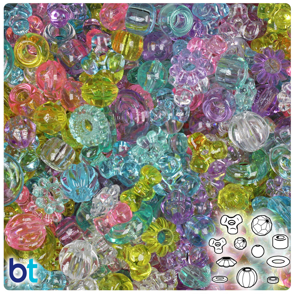 Our pastel multi-colored mix, in a see through transparent finish, mixed bead shaped plastic craft beads in a mixture of rounds, faceted rounds, tribeads, donuts, discs, floral rings, melons, and mini barrels. These craft beads measure between 6mm and 14mm and have both 1mm and 4mm holes. These plastic craft beads are made in the USA with high-quality plastic and come in packs of 4oz approx. 300 beads. Craft Beads are ideal for making necklaces, bracelets, key chain and other jewelry projects, as well as holiday decorations, home bedazzling and many other craft ideas. They are also perfect for children's craft projects and church or activity camps. Craft Beads come with a small 1-2mm hole, so they will fit on a range of threading material like elastic cord, stretchy cord and jewelry wire.