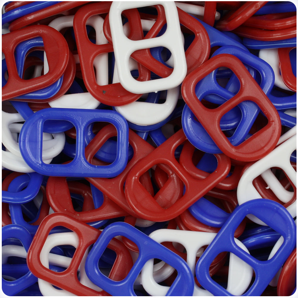Our patriotic mix opaque finish plastic soda pop tabs measure 24mm long and 16mm wide. They bend without breaking, string easily and in contrast to metal tabs, these plastic versions are safer and easier to work with for crafters, lacking sharp edges and the need for clipping. Made in the USA and sold in zip-lock bags of approx. 150 tabs.