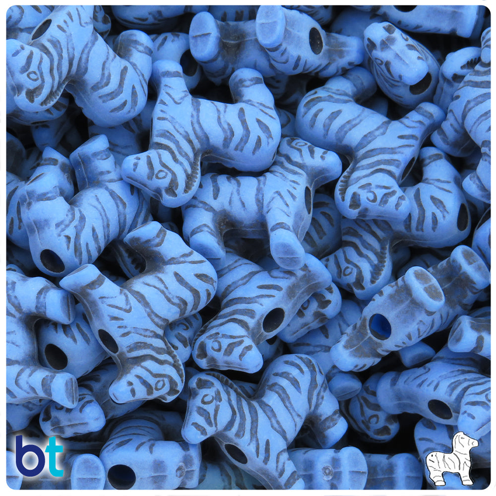 These periwinkle blue antique zebra shaped pony beads, from the safari animal series, measure 22mm long by 20mm high and have a 4mm hole which runs along the middle of the beads. These plastic novelty pony beads are made in the USA with high-quality plastic and come in packs of 8 beads.