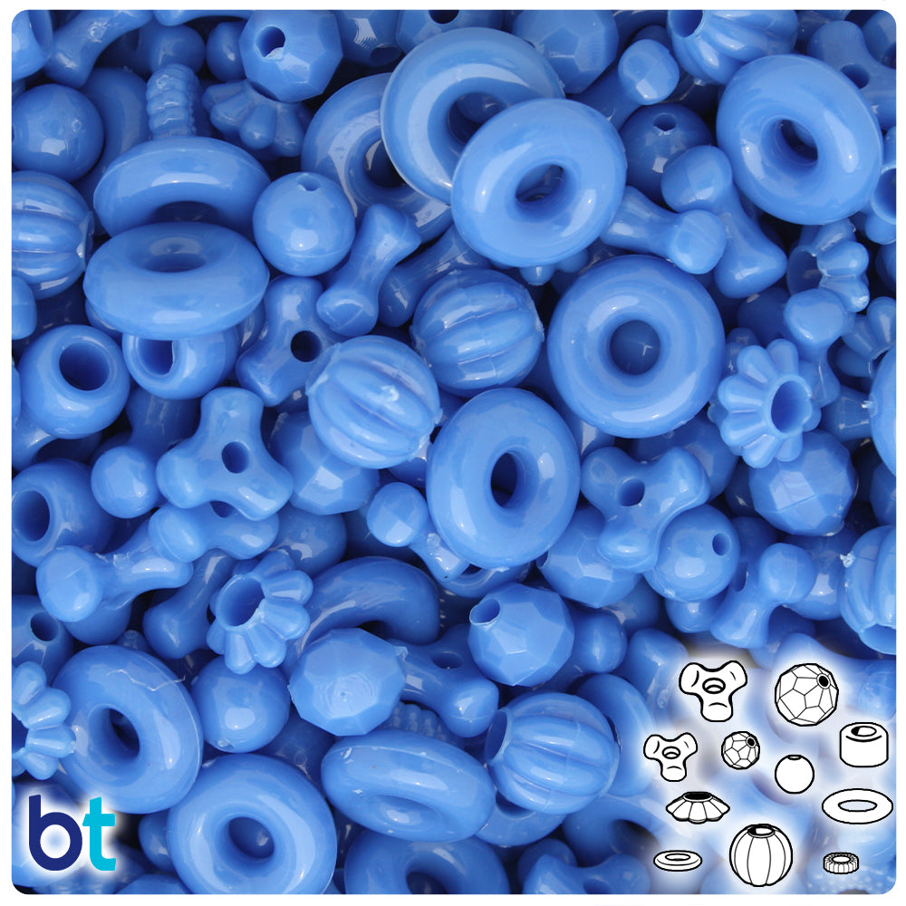 Our periwinkle blue, in a shiny opaque finish, mixed bead shaped plastic craft beads in a mixture of rounds, faceted rounds, tribeads, donuts, discs, floral rings, melons, and mini barrels. These craft beads measure between 6mm and 14mm and have both 1mm and 4mm holes. These plastic craft beads are made in the USA with high-quality plastic and come in packs of 4oz approx. 300 beads. Craft Beads are ideal for making necklaces, bracelets, key chain and other jewelry projects, as well as holiday decorations, home bedazzling and many other craft ideas. They are also perfect for children's craft projects and church or activity camps. Craft Beads come with a small 1-2mm hole, so they will fit on a range of threading material like elastic cord, stretchy cord and jewelry wire.