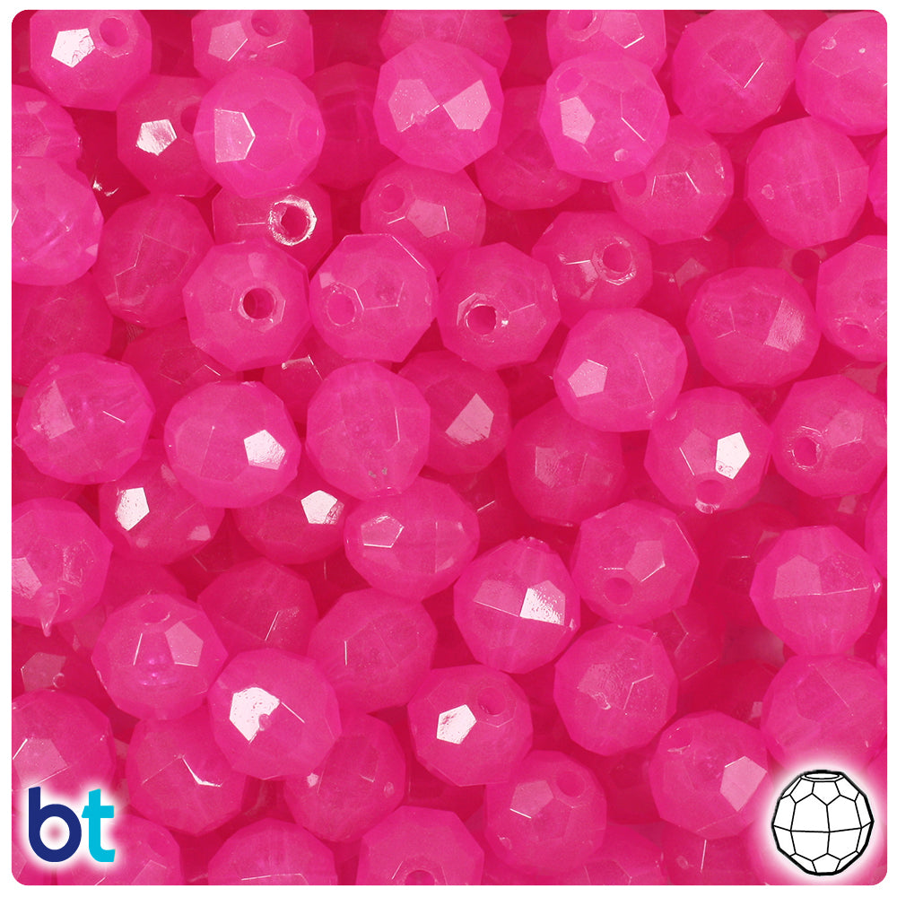 Our pink, in a semi glow finish, faceted round plastic craft beads measure 10mm diameter and have a 2mm hole which runs through the center of the bead. These plastic craft beads are made in the USA with high-quality non-toxic plastic and come in packs of approx. 225 beads. Craft Beads are ideal for making necklaces, bracelets, key chain and other jewelry projects, as well as holiday decorations, home bedazzling and many other craft ideas. They are also perfect for children's craft projects and church or activity camps. Craft Beads come with a smaller hole, so they will fit on a range of threading material like elastic cord, stretchy cord and jewelry wire.