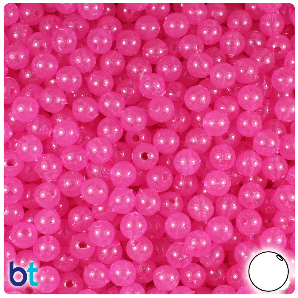 Our pink, in a semi glow finish, round plastic craft beads measure 6mm diameter and have a 1mm hole which runs through the center of the bead. These plastic craft beads are made in the USA with high-quality plastic and come in packs of approx. 500 beads. Craft Beads are ideal for making necklaces, bracelets, key chain and other jewelry projects, as well as holiday decorations, home bedazzling and many other craft ideas. They are also perfect for children's craft projects and church or activity camps. Craft Beads come with a small 1-2mm hole, so they will fit on a range of threading material like elastic cord, stretchy cord and jewelry wire.