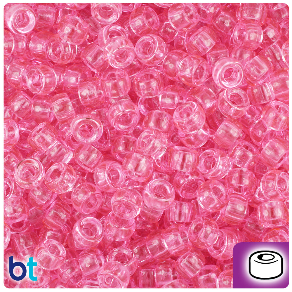 Our pink, in a see through transparent finish, mini barrel shaped plastic pony beads, measure 6.5mm high by 4mm high and have a 3mm hole which runs vertically down the middle of the bead. These plastic pony beads are made in the USA with high-quality, non-toxic polystyrene plastic and sold in packs of approx. 1000 beads. Pony beads are ideal for a wide variety of projects like; necklaces, bracelets, kandi and dream catchers. The larger hole is easier to thread so makes them perfect for children's parties, activity camps and VBS.