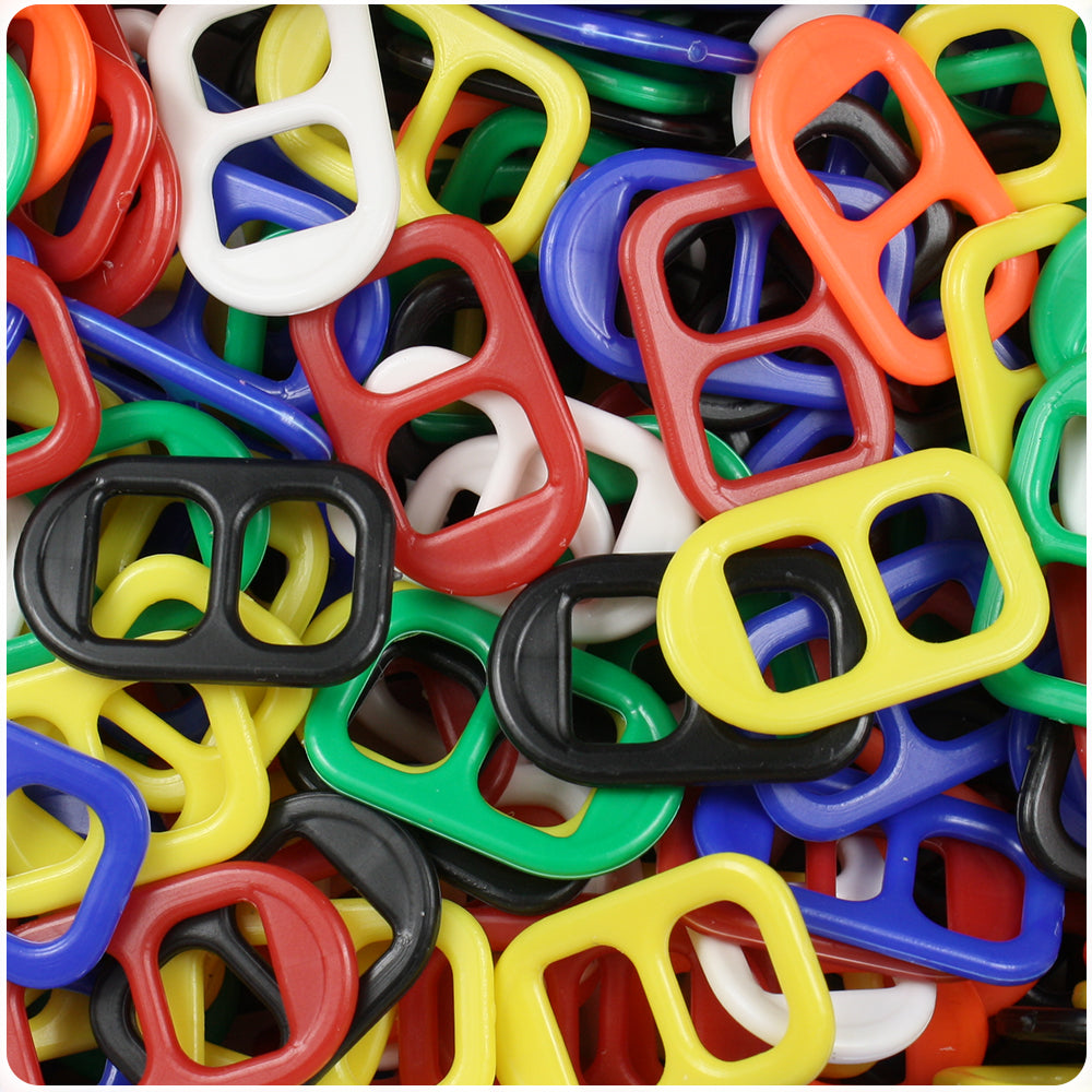 These primary colors mix opaque plastic soda pop tabs measure 24mm long and 16mm wide. They bend without breaking, string easily and do not have sharp edges like metal tabs and come in packs of approx. 135 tabs. Our plastic craft products are made in the USA with high-quality plastic.