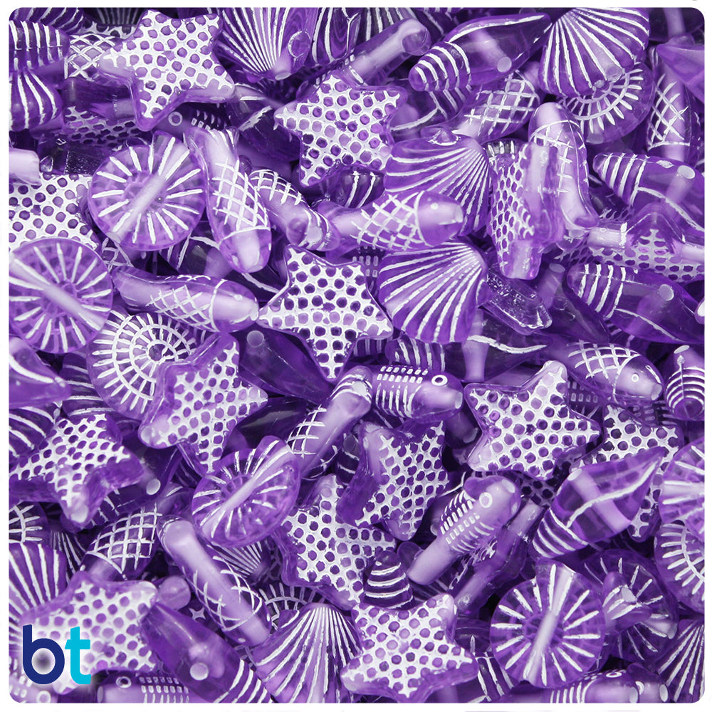 These purple transparent sea life miniature mix plastic/acrylic craft beads measure approx. 10mm with a 1mm hole which runs through the center of the bead and features white details on the various shapes. Our acrylic craft beads are imported from China and come in packs of 50g which is approx 140 beads.