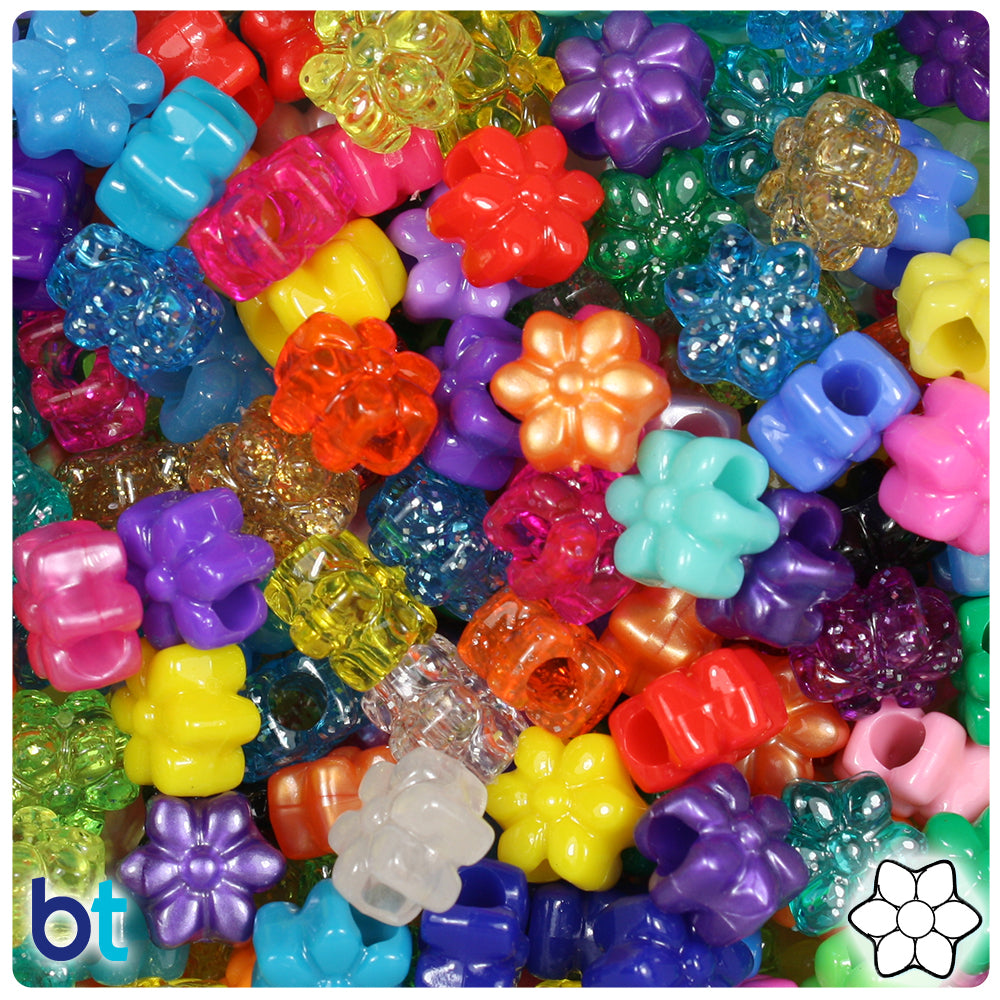 Our multi-colored mix, in a random mix of finishes, flower shaped plastic pony beads, measure 13mm wide by 13mm high and have a 4mm hole which runs vertically down the middle of the bead. These plastic pony beads are made in the USA with high-quality, non-toxic polystyrene plastic and sold in packs of approx. 250 beads. Pony beads are ideal for a wide variety of projects like; necklaces, bracelets, kandi and dream catchers. The larger hole is easier to thread so makes them perfect for children's parties, activity camps and VBS.