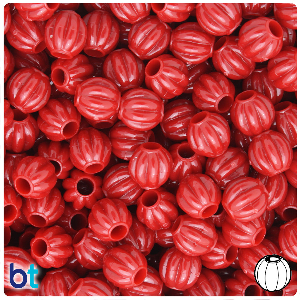 These red opaque melon shaped pony beads measure 10mm diameter and have a 4mm hole which runs down the middle of the beads. Our plastic pony beads are made in the USA with high-quality plastic and these come in packs of approx. 60 beads.