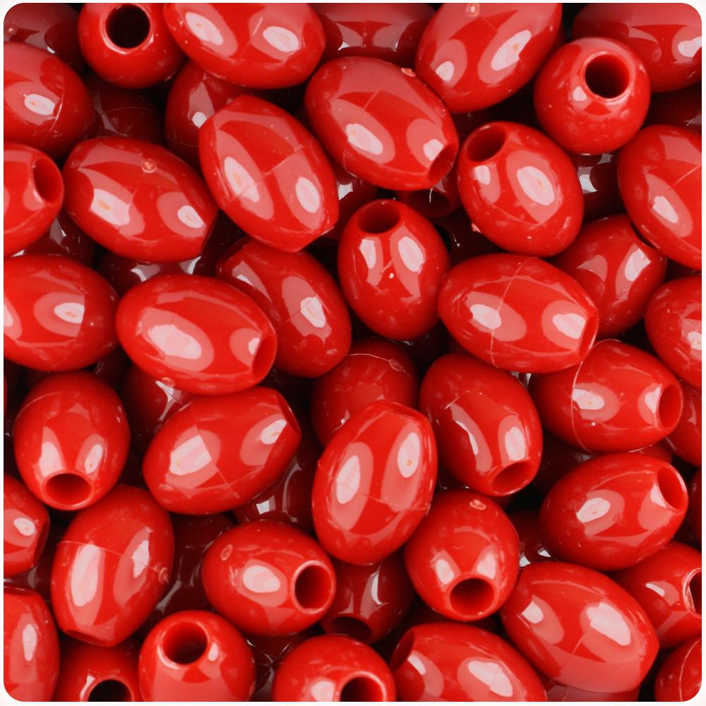 These red opaque oval shaped pony beads measure 14mm long by 10mm wide and have a 4mm hole which runs down the middle of the beads. Our plastic pony beads are made in the USA with high-quality plastic and come in packs of approx. 40 beads.
