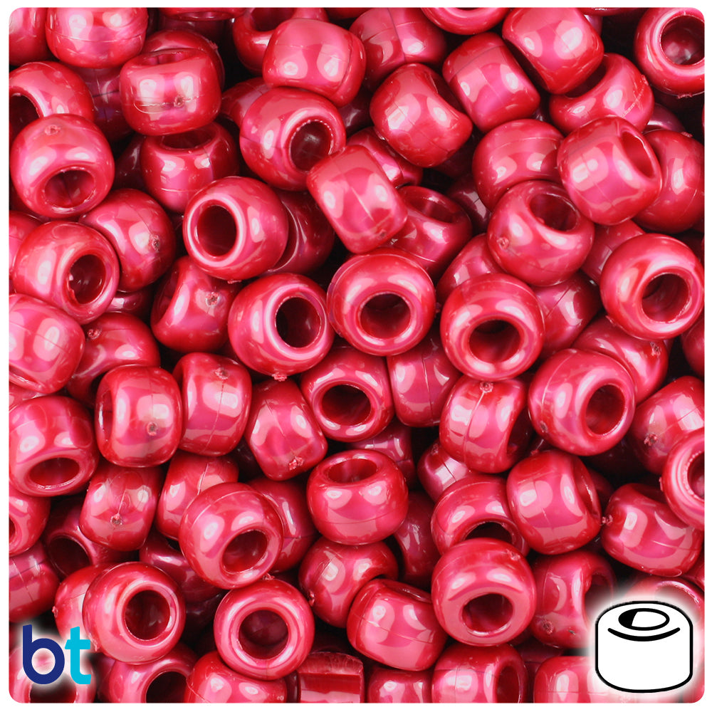 Our red, in a shimmering pearl finish barrel shaped plastic pony beads, measure 6mm high by 9mm wide and have a 4mm hole which runs vertically down the middle of the bead. These plastic pony beads are made in the USA with high-quality, non-toxic polystyrene plastic and sold in packs of approx. 500 beads. Pony beads are ideal for a wide variety of projects like; necklaces, bracelets, kandi and dream catchers. The larger hole is easier to thread so makes them perfect for children's parties, activity camps and VBS.