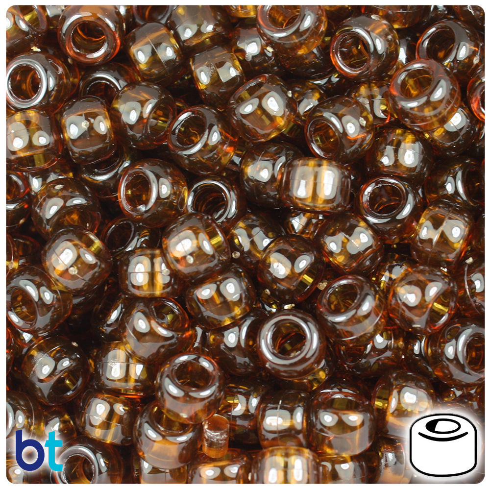 Our root beer brown, in a see through transparent finish barrel shaped plastic pony beads, measure 6mm high by 9mm wide and have a 4mm hole which runs vertically down the middle of the bead. These plastic pony beads are made in the USA with high-quality, non-toxic polystyrene plastic and sold in packs of approx. 500 beads. Pony beads are ideal for a wide variety of projects like; necklaces, bracelets, kandi and dream catchers. The larger hole is easier to thread so makes them perfect for children's parties, activity camps and VBS.