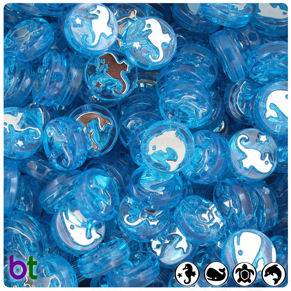 These turquoise blue transparent sea life picture plastic craft beads measure 13mm diameter, 5mm thick and have a 1.5mm hole. They feature a variety of designs; sea horse, whale, dolphin and sea turtle in a silver print. Made in the USA with non-toxic polystyrene plastic and sold in packs of approx 30 beads.