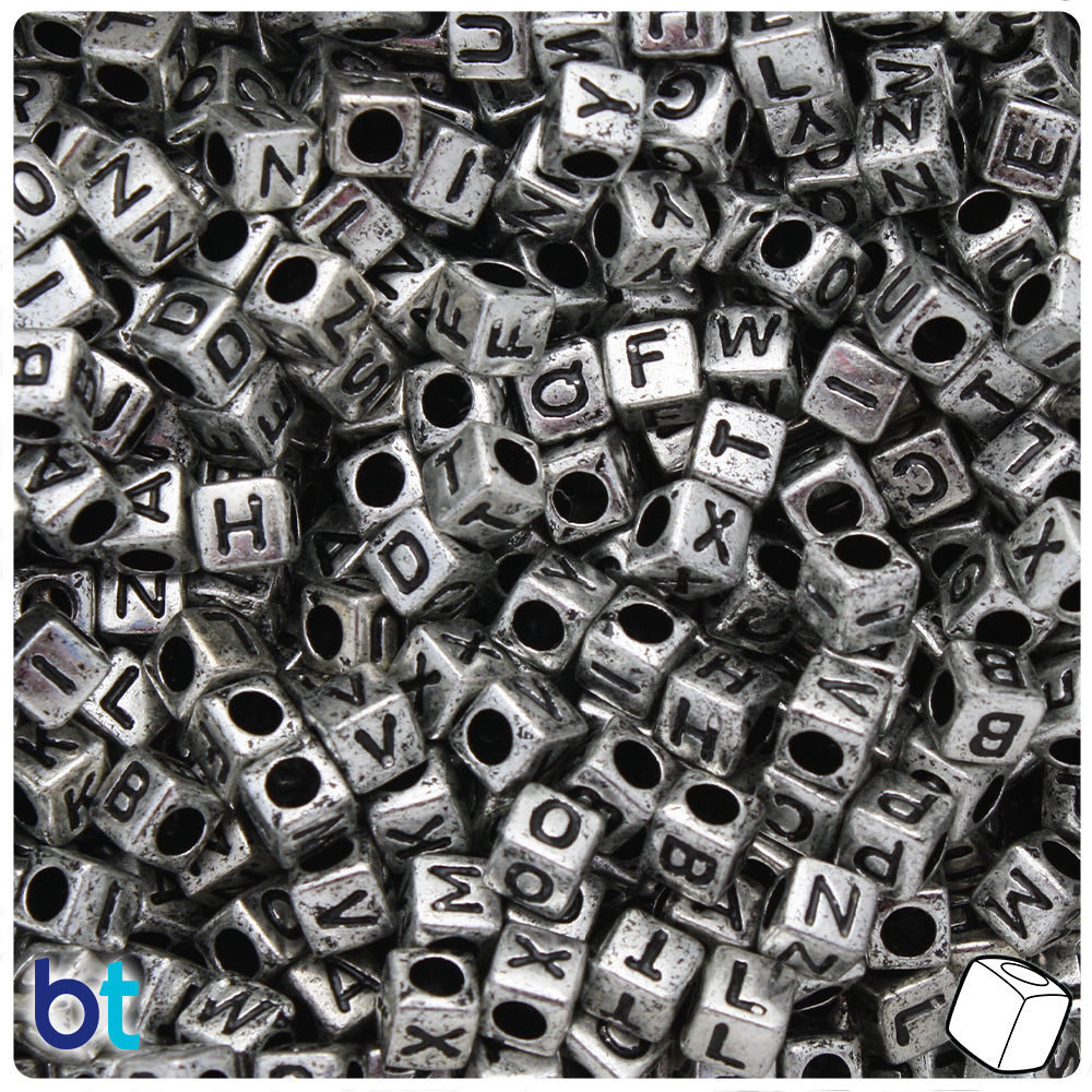 These silver metallic 6mm cube alphabet plastic beads have a 3.5mm hole which runs horizontally to the letter which is imprinted on four sides of the beads in black. Imported from China and sold in packs of approx. 200 beads.