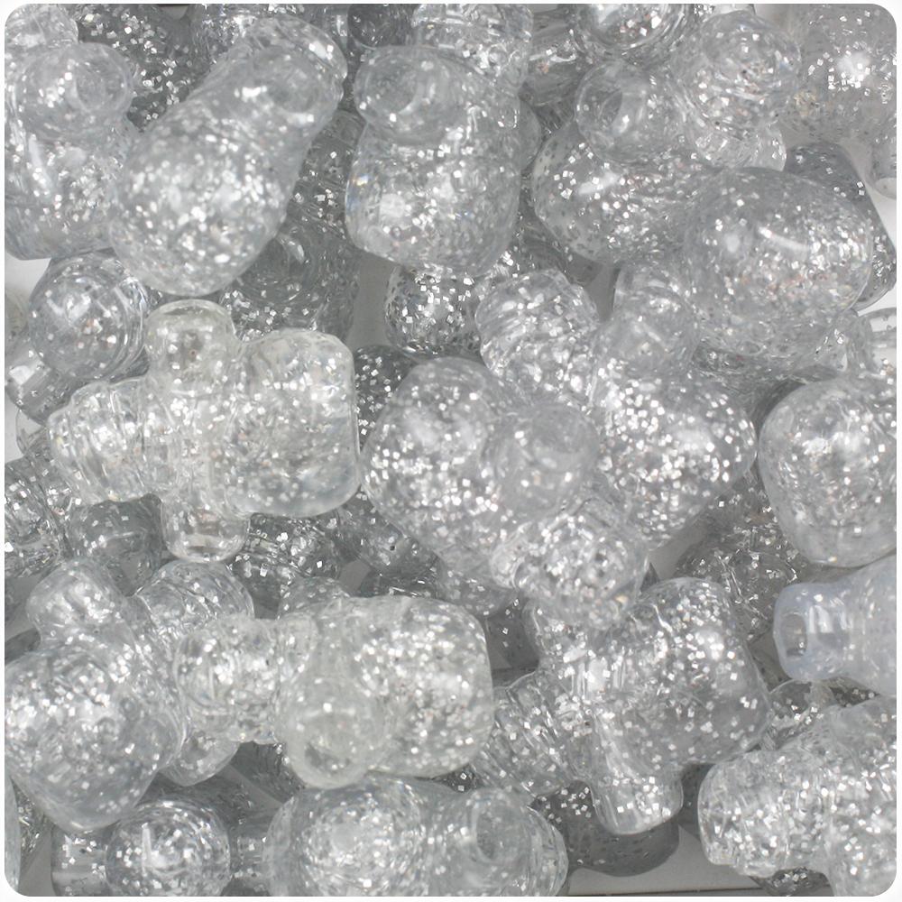 A pack of silver sparkle snowman shaped novelty pony beads from the holiday series. These plastic pony beads measure 18mm wide and 22mm high, with a 4mm hole running horizontally across the middle of the bead. Our pony beads are made in the USA with non-toxic polystyrene plastic and are sold in packs of 8 beads.