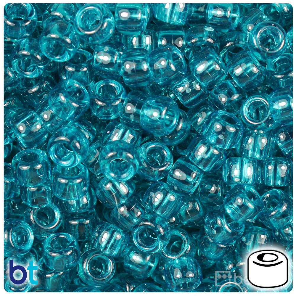 Our teal green, in a see through transparent finish barrel shaped plastic pony beads, measure 6mm high by 9mm wide and have a 4mm hole which runs vertically down the middle of the bead. These plastic pony beads are made in the USA with high-quality, non-toxic polystyrene plastic and sold in packs of approx. 500 beads. Pony beads are ideal for a wide variety of projects like; necklaces, bracelets, kandi and dream catchers. The larger hole is easier to thread so makes them perfect for children's parties, activity camps and VBS.