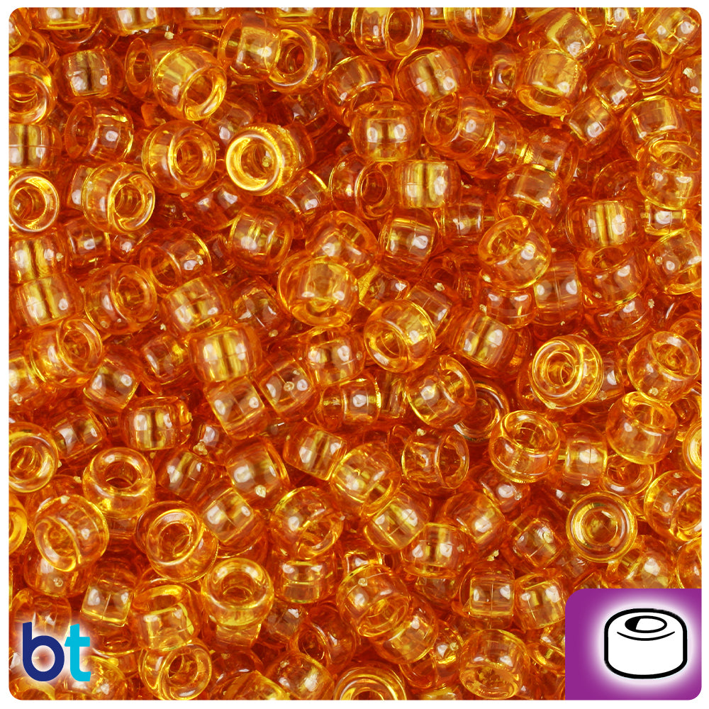 Our topaz gold, in a see through transparent finish, mini barrel shaped plastic pony beads, measure 6.5mm high by 4mm high and have a 3mm hole which runs vertically down the middle of the bead. These plastic pony beads are made in the USA with high-quality, non-toxic polystyrene plastic and sold in packs of approx. 1000 beads. Pony beads are ideal for a wide variety of projects like; necklaces, bracelets, kandi and dream catchers. The larger hole is easier to thread so makes them perfect for children's parties, activity camps and VBS.