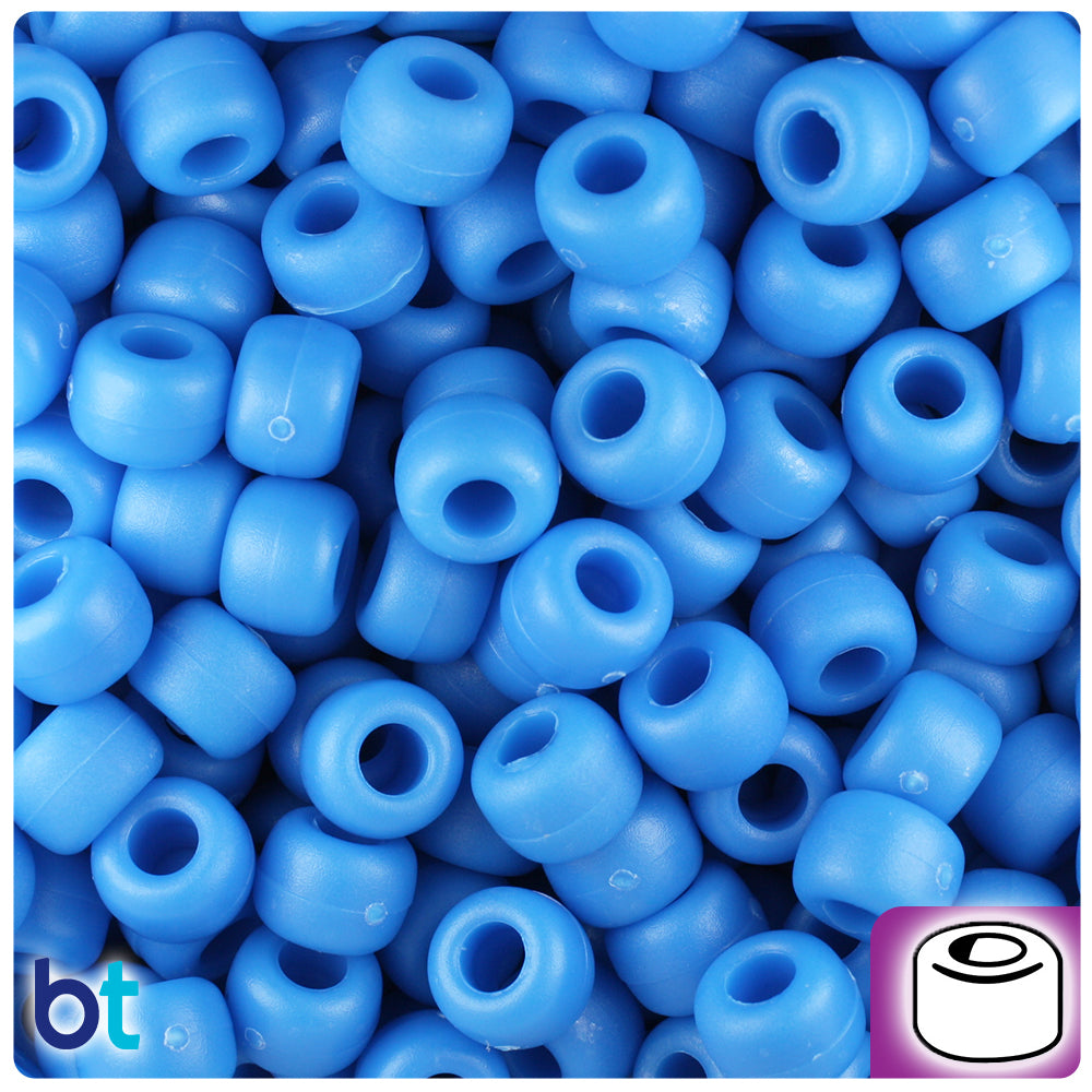 Our true blue, in a textured matte finish barrel shaped plastic pony beads, measure 6mm high by 9mm wide and have a 4mm hole which runs vertically down the middle of the bead. These plastic pony beads are made in the USA with high-quality, non-toxic polystyrene plastic and sold in packs of approx. 500 beads. Pony beads are ideal for a wide variety of projects like; necklaces, bracelets, kandi and dream catchers. The larger hole is easier to thread so makes them perfect for children's parties, activity camps and VBS.