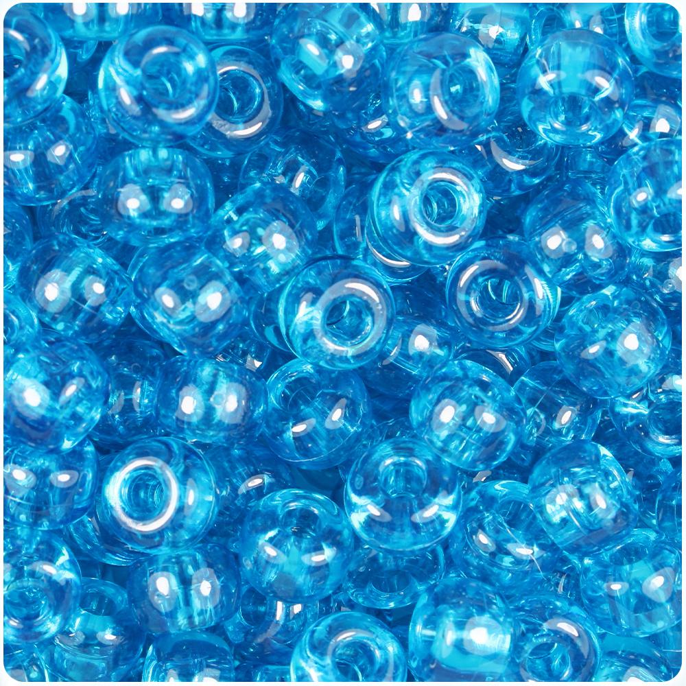 These turquoise transparent large barrel pony beads measure 11mm wide by 8mm high and have a 4mm hole which runs vertically down the middle of the beads. Our plastic pony beads are made in the USA with high-quality plastic and come in packs of approx. 50 beads.