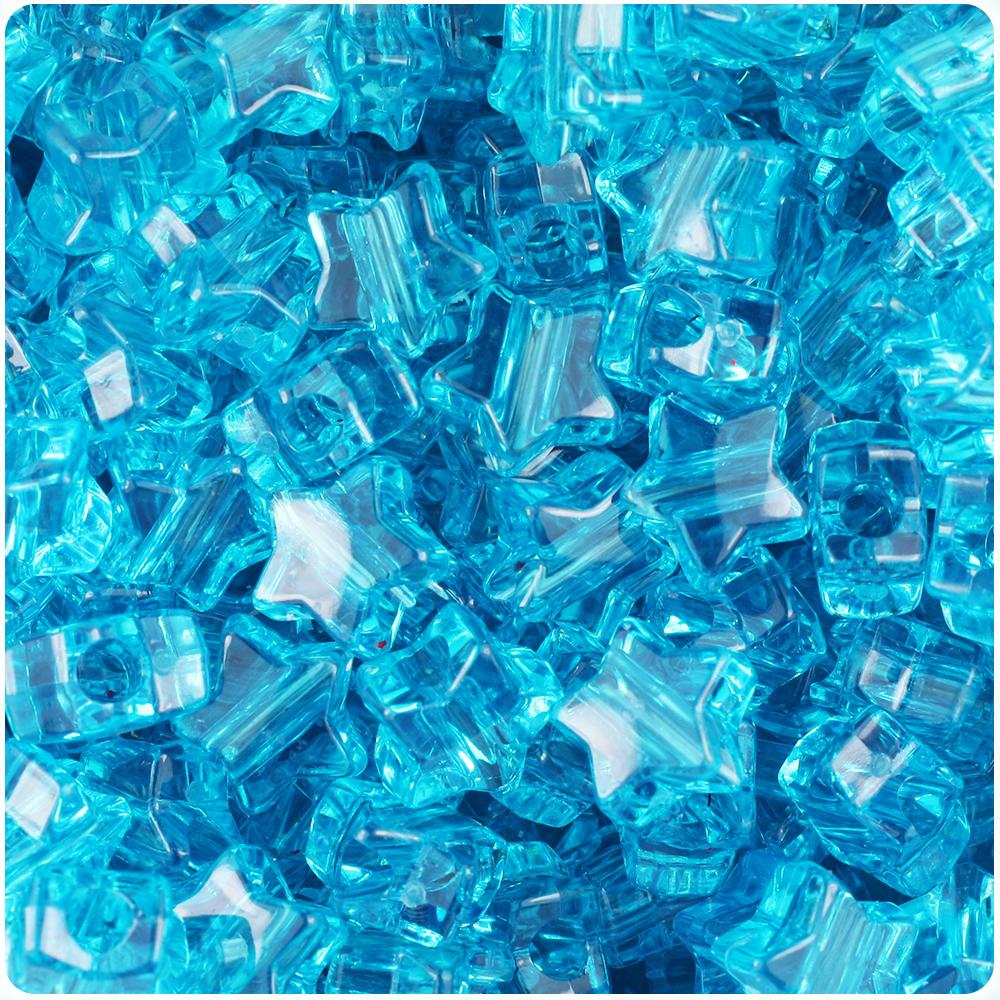 These turquoise transparent star shaped pony beads measure 13mm wide by 13mm high and have a 4mm hole which runs vertically down the middle of the beads. Our plastic pony beads are made in the USA with high-quality plastic and come in packs of approx. 50 beads.