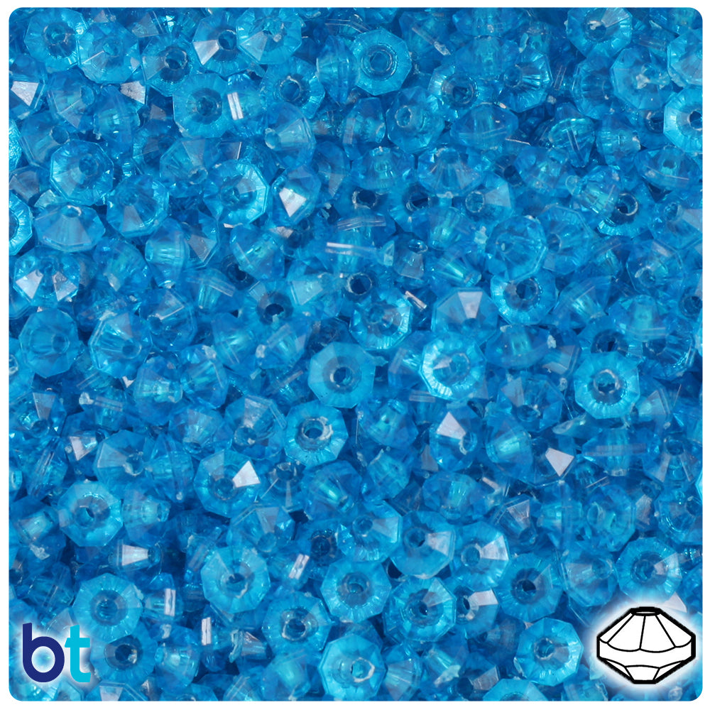 Our turquoise blue, in a see through transparent finish, faceted round plastic craft beads measure 6mm wide and 4mm high and at the highest point a 1mm hole which runs through the center of the bead. These plastic craft beads are made in the USA with high-quality non-toxic plastic and come in packs of approx. 1350 beads. Craft Beads are ideal for making necklaces, bracelets, key chain and other jewelry projects, as well as holiday decorations, home bedazzling and many other craft ideas. They are also perfect for children's craft projects and church or activity camps. Craft Beads come with a smaller hole, so they will fit on a range of threading material like elastic cord, stretchy cord and jewelry wire.