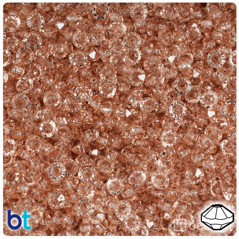 Our vintage peach orange, in a see through transparent finish, faceted round plastic craft beads measure 6mm wide and 4mm high and at the highest point a 1mm hole which runs through the center of the bead. These plastic craft beads are made in the USA with high-quality non-toxic plastic and come in packs of approx. 1350 beads. Craft Beads are ideal for making necklaces, bracelets, key chain and other jewelry projects, as well as holiday decorations, home bedazzling and many other craft ideas. They are also perfect for children's craft projects and church or activity camps. Craft Beads come with a smaller hole, so they will fit on a range of threading material like elastic cord, stretchy cord and jewelry wire.