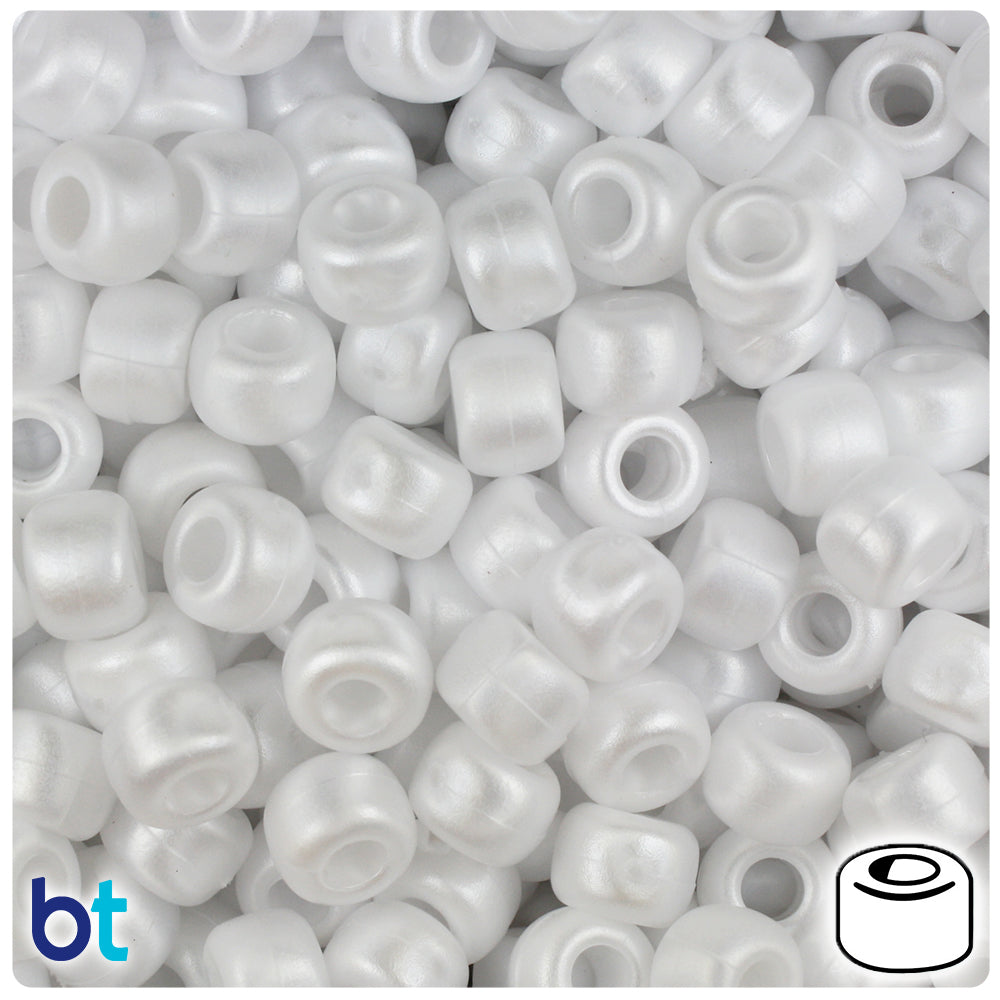 Our white, in an ashed shimmering pearl finish barrel shaped plastic pony beads, measure 6mm high by 9mm wide and have a 4mm hole which runs vertically down the middle of the bead. These plastic pony beads are made in the USA with high-quality, non-toxic polystyrene plastic and sold in packs of approx. 500 beads. Pony beads are ideal for a wide variety of projects like; necklaces, bracelets, kandi and dream catchers. The larger hole is easier to thread so makes them perfect for children's parties, activity camps and VBS.