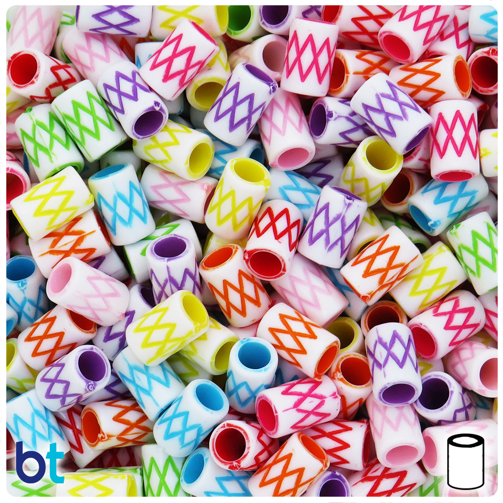Our white opaque finish cylinder (column/drum) shaped plastic craft beads measure 7.4mm wide by 11.4mm high (hole to hole) and have a large 4.6mm hole which runs through the center of the bead. The beads have a zigzag design printed around the beads in various colors. These plastic/acrylic craft beads are imported from China and come in packs of approx. 150 beads. Our printed Craft Beads are ideal for making necklaces, bracelets, key chain and other personalized jewelry projects.