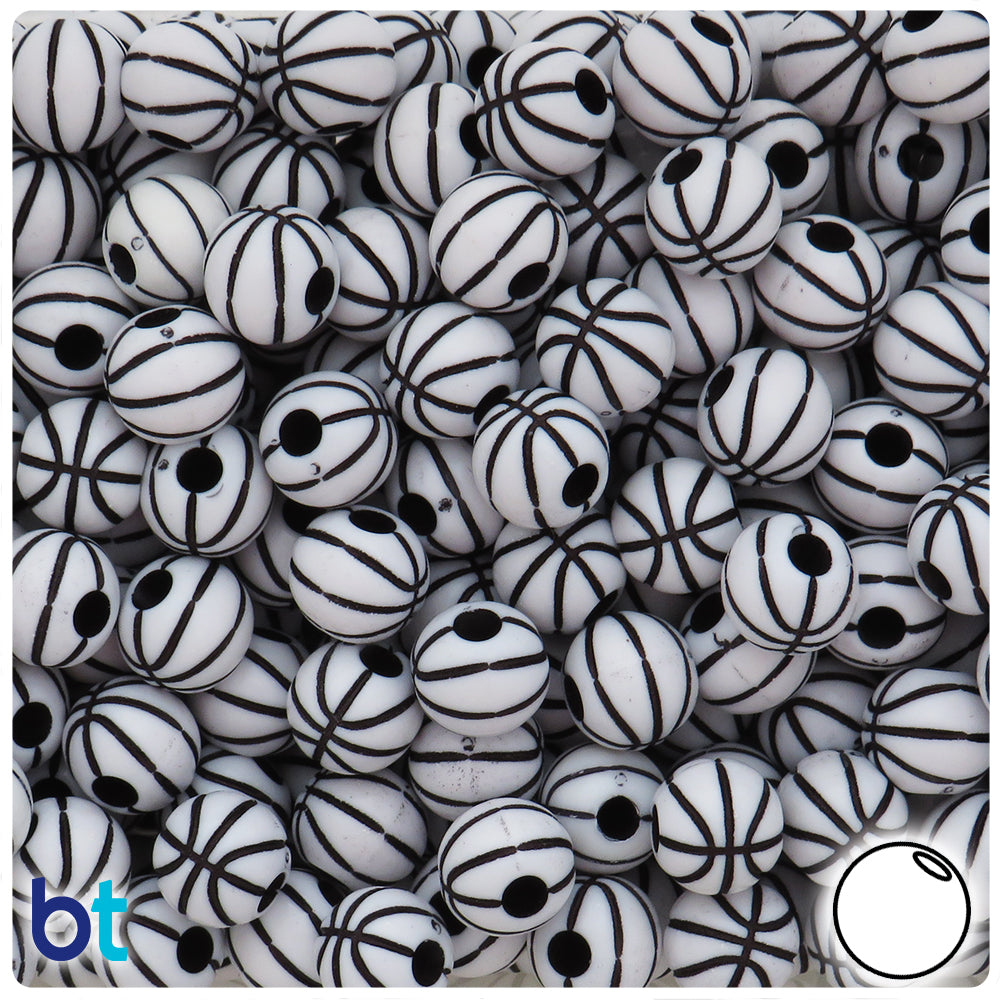 Our white shiny opaque finish round, black basketball design, pony beads measure 12mm diameter and have a 4mm hole that runs horizontally from nose to tail of the bead. These plastic novelty pony beads are imported from China and are sold in packs of approx. 48 beads. Pony beads are ideal for a wide variety of projects like; necklaces, bracelets, kandi and dream catchers. The larger hole is easier to thread so makes them perfect for children's parties, activity camps and VBS.