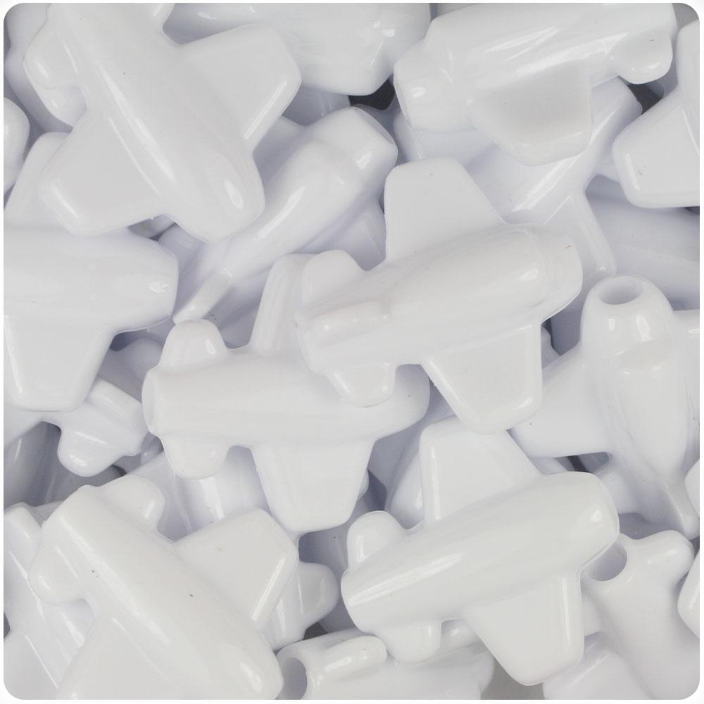These white opaque airplane shaped pony beads measure 25mm across by 25mm long and have a 4mm hole which runs down the middle of the beads from the nose to the tail. These plastic novelty pony beads are made in the USA with high-quality plastic and come in packs of 8 beads.