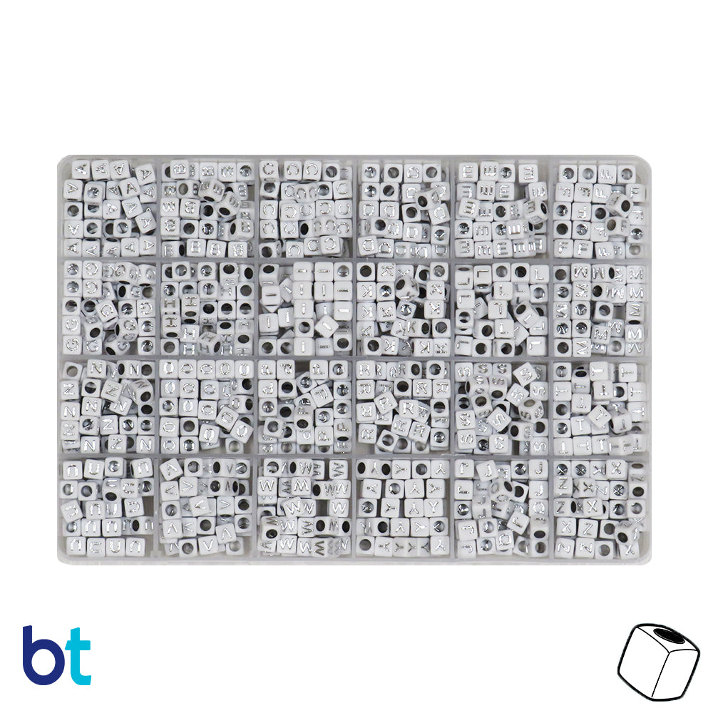 Our white opaque finish cube shaped alphabet beads measure 6.1mm wide by 5.8mm high and have a 3.5mm hole which runs horizontally to the letter which is imprinted on four sides of the beads in silver. These alpha bead kits are imported from China and have approx. 1100 beads in a re-usable storage container. Our alpha beads are perfect for personalizing necklaces, bracelets, key chains and all manner of kandi designs.