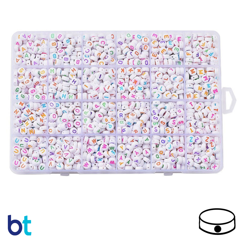 These white opaque finish coin shaped alphabet plastic beads measure 7mm diameter by 4mm thick and have a 1mm hole which runs horizontally to the letter which is imprinted on both sides of the beads in various colors. These alpha bead kits are imported from China and sold in packs of approx. 1488 beads and a re-usable storage container. Our alpha beads are perfect for personalizing necklaces, bracelets, key chains and all manner of kandi designs.