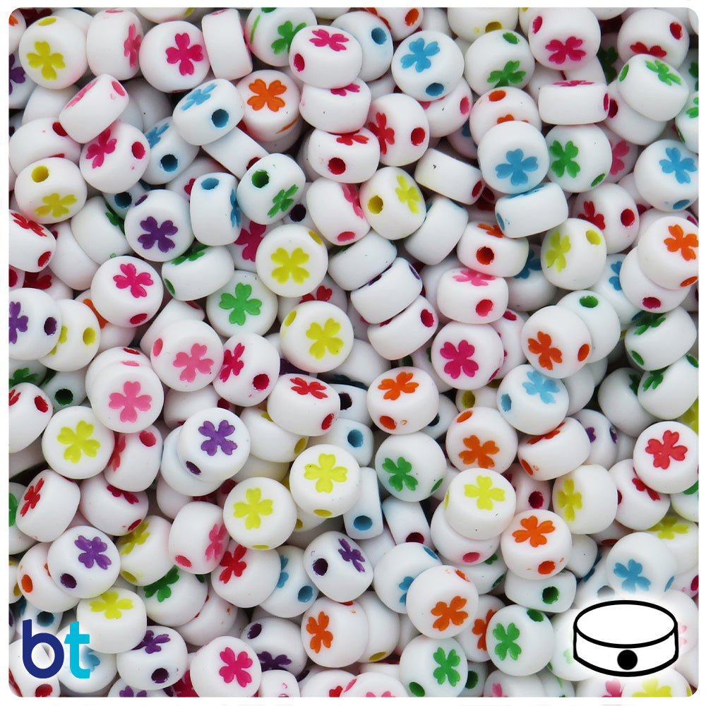 Our white opaque finish coin shaped alphabet plastic beads measure 6.8mm wide (hole to hole) by 3.4mm thick and have a 1.2mm hole which runs horizontally to the shamrock (or lucky clover leaf) which is imprinted on both sides of the beads in various colors. These craft beads are imported from China and sold in packs of approx. 250 beads. Our alpha beads are perfect for personalizing necklaces, bracelets, key chains and all manner of kandi designs.