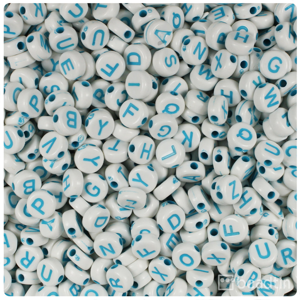 These white opaque 7mm coin alphabet plastic beads have a 1mm hole which runs horizontally to the letter which is imprinted on both sides of the beads in light blue. Imported from China and sold in packs of approx. 250 beads.