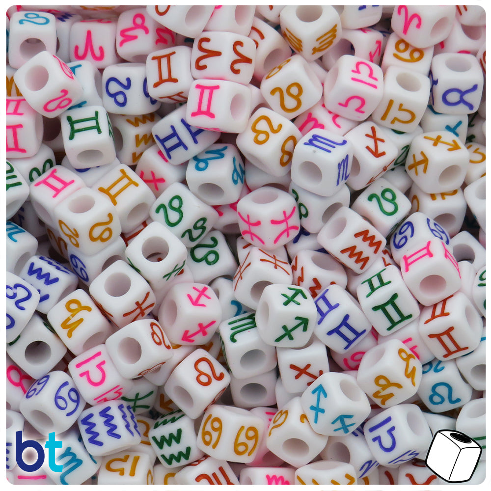 These white opaque cube shaped alphabet plastic beads measure 7mm high by 7mm wide and have a 4mm hole which runs horizontally to the signs which are imprinted on four sides of the beads in various colors. This pack contains a random mix of constellations and colors. These craft beads are imported from China and sold in packs of approx. 150 beads. Our alpha beads are perfect for personalizing necklaces, bracelets, key chains and all manner of kandi designs.
