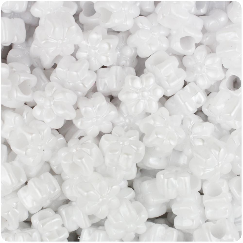 These white pearl flower shaped pony beads measure 13mm wide by 13mm high and have a 4mm hole which runs vertically down the middle of the beads. Our plastic pony beads are made in the USA with high-quality plastic and come in packs of approx. 50 beads.
