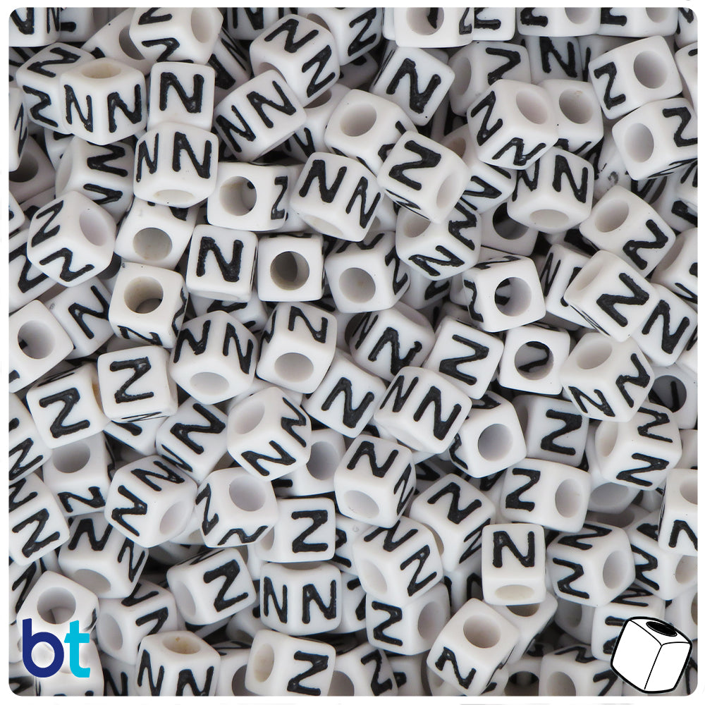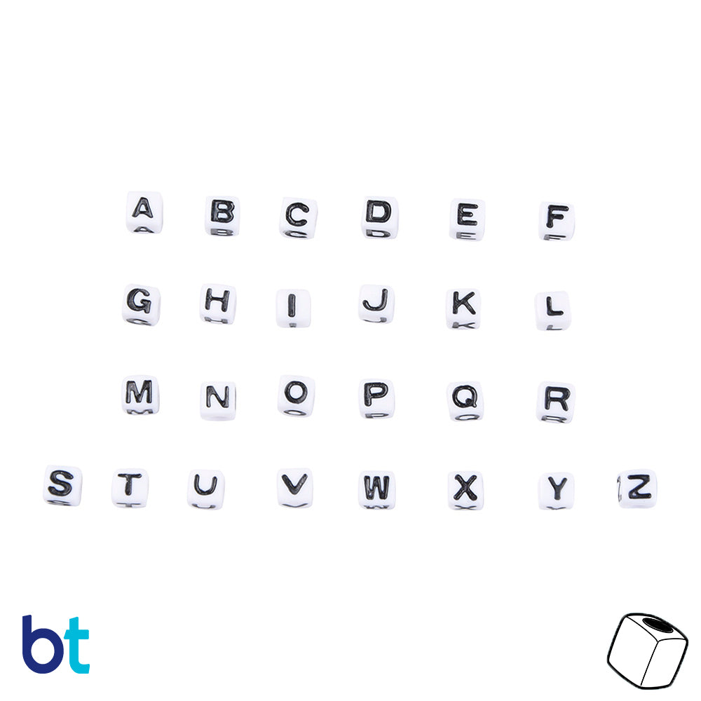 Our white opaque cube shaped alphabet plastic beads measure 6.8mm wide (hole to hole) by 6.6mm high and have a 3.6mm hole which runs horizontally to the letter which is imprinted on four sides of the beads in black. These wholesale craft beads are imported from China and sold in packs of approx. 1900 beads. This is our wholesale offering for the smaller packs with 80 beads.