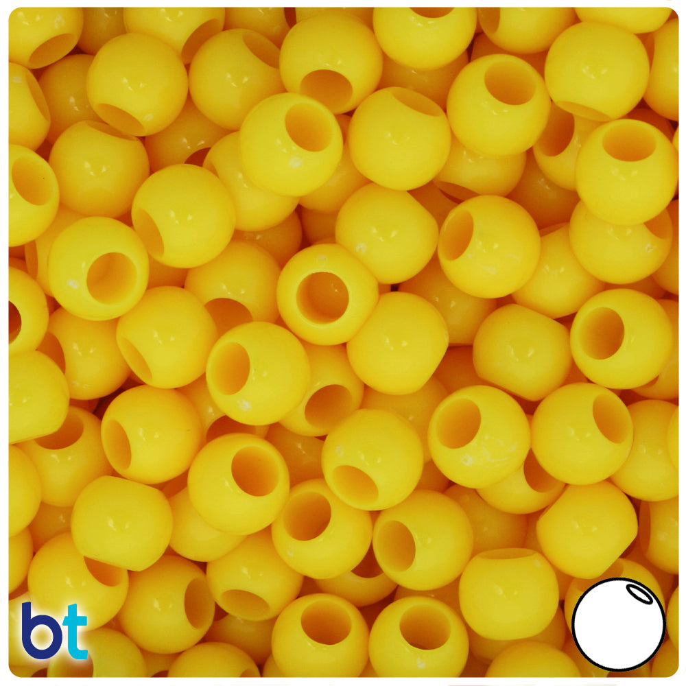 These yellow opaque round pony beads measure 10mm wide by 8mm high and have a 5mm hole which runs vertically down the middle of the beads. These beads are imported from China and come in packs of approx. 125 beads.