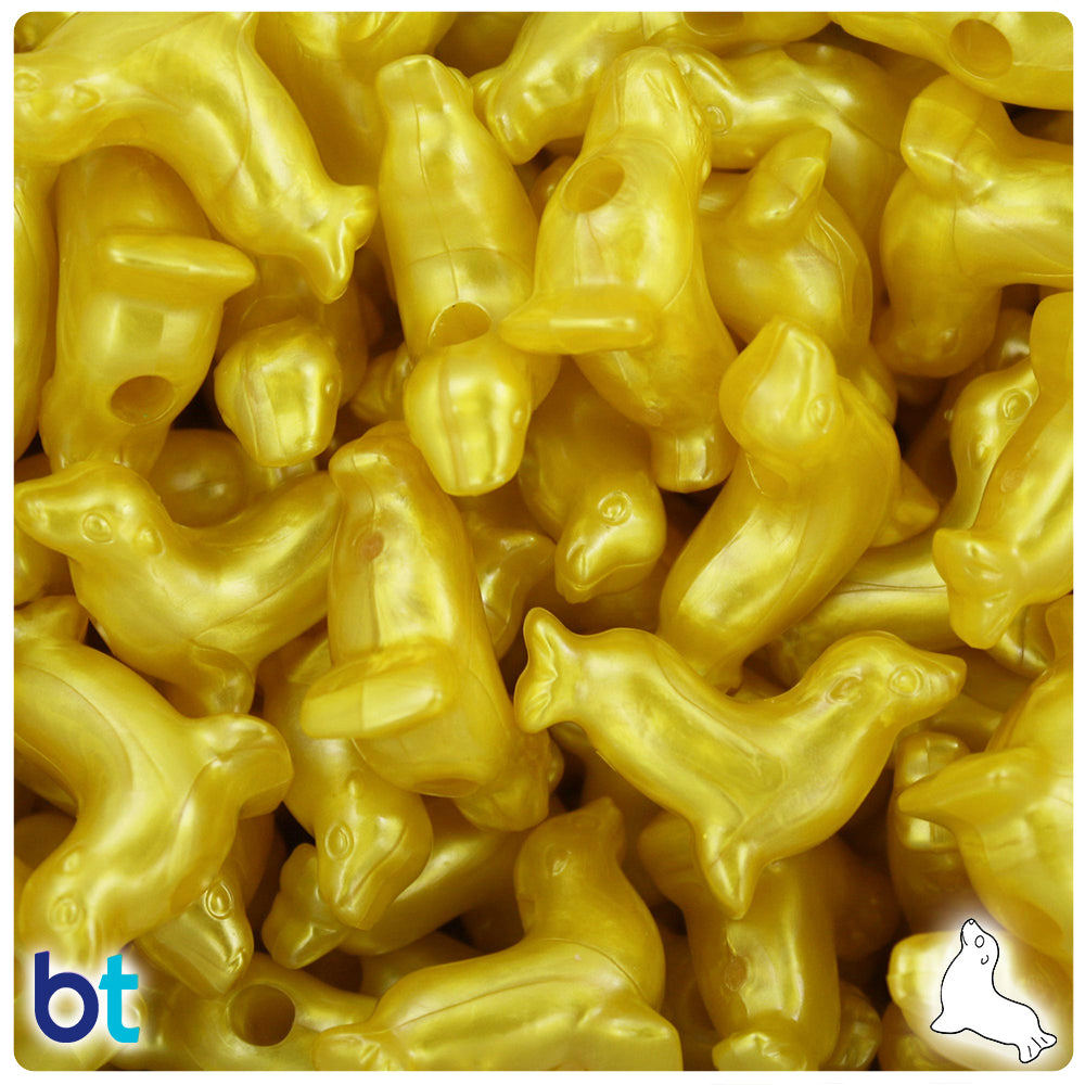 Our yellow, in a shimmering pearl finish, seal shaped plastic pony beads from the marine life series. These pony beads measure 24mm long by 21mm high and have a 4mm hole which runs horizontally through the middle of the bead. These plastic pony beads are made in the USA with high-quality, non-toxic polystyrene plastic and sold in packs of approx. 24 beads. Pony beads are ideal for a wide variety of projects like; necklaces, bracelets, kandi, marine life and summer designs and dream catchers. The larger hole is easier to thread so makes them perfect for children's parties, activity camps and VBS.