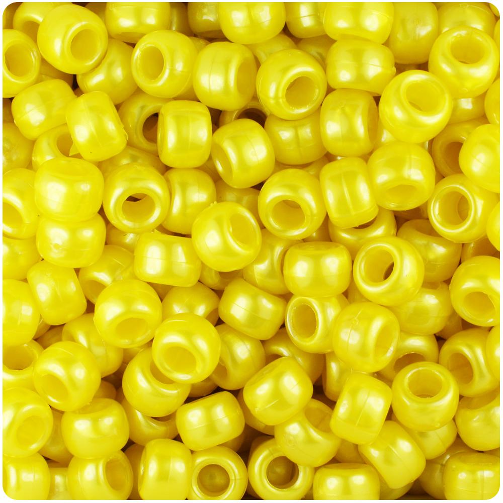 These yellow shimmering pearl standard barrel pony beads measure 9mm wide by 6mm high and have a 4mm hole which runs vertically down the middle of the beads. Our plastic pony beads are made in the USA with high-quality plastic and come in packs of approx. 100 beads.